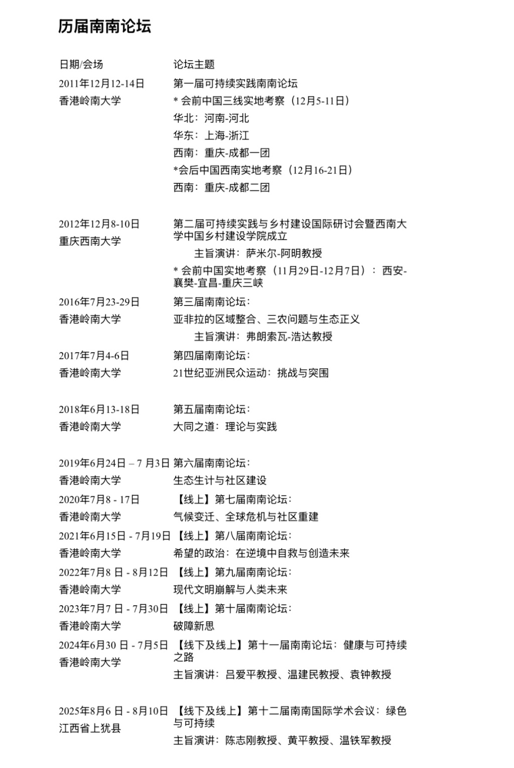 自2011年12月主办第一届南南论坛,我们已经成功举办了十一届论坛,除了第二届以外,所有南南论坛都在香港岭南大学举行。我们邀请来自世界各地的专家学者、社会实践者汇聚一堂,就人类文明、另类实践、生计民生、生态文明、可持续发展等议题进行深入的对话交流。由于经费所限,第三届相隔4年后才恢复举办,之后每年进行。2020年,新冠肺炎疫情暴发,催生了网络会议蓬勃发展,论坛改为线上反而方便全球各地参会者;2020年的第七届论坛,过半全球大学创始成员参加。第七届至第九届南南论坛,每届平均设置35个场次,有50个国家、150位讲者、逾千位参会者进行思想、理论、经验交流。全部视频和参考文献,可在岭南大学和全球大学网站上浏览。到了第十一和十二届,转为线上线下同时进行,第十二届更是由香港中国研究院主办,在江西省上犹县举行。