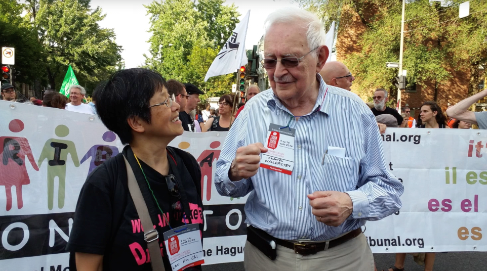 伊曼纽尔·沃勒斯坦(Immanuel Wallerstein,右) 与 刘健芝(左)。2016年,加拿大蒙特利尔世界社会论坛开幕游行。