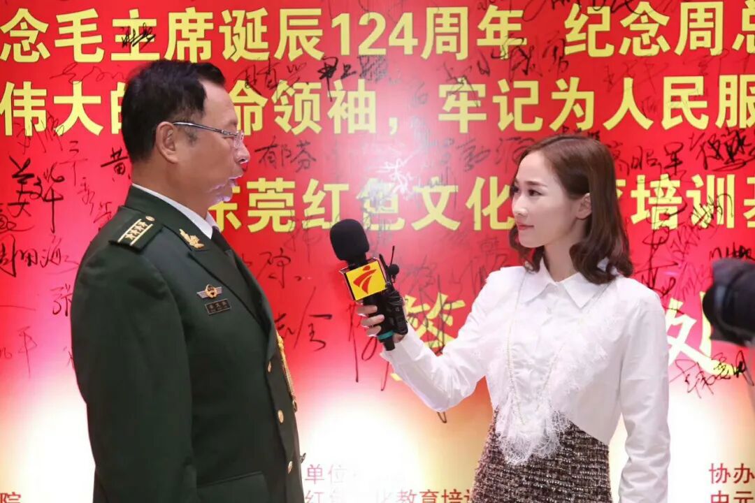 2017年12月26日,中国第六届红色工程感恩会、“红色工程·感恩行动”全国行活动走进广东东莞、纪念毛主席诞辰124周年 纪念周总理诞辰120周年、“缅怀伟大的革命领袖 牢记为人民服务的宗旨”高峰论坛暨广东东莞红色文化教育培训基地揭牌,在广东东莞举行。这是红色文化研究院执行院长、原武警武汉指挥学校副校长、中国拥军优属基金会副秘书长姜文华在活动上接受广东卫视采访。