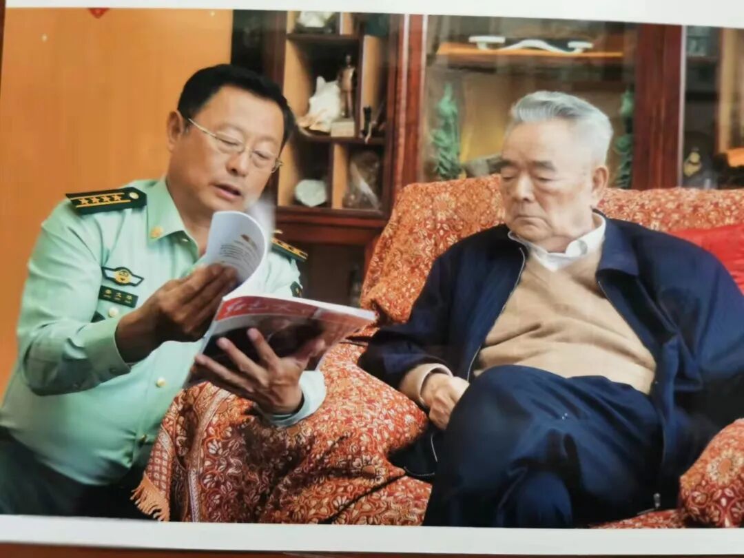 老红军、原成都军区政委万海峰上将(中)同秘书孙德阁大校(左)、原武警武汉指挥学校副校长、中国萧军研究会副会长兼红色文化研究院执行院长姜文华(右)合影。