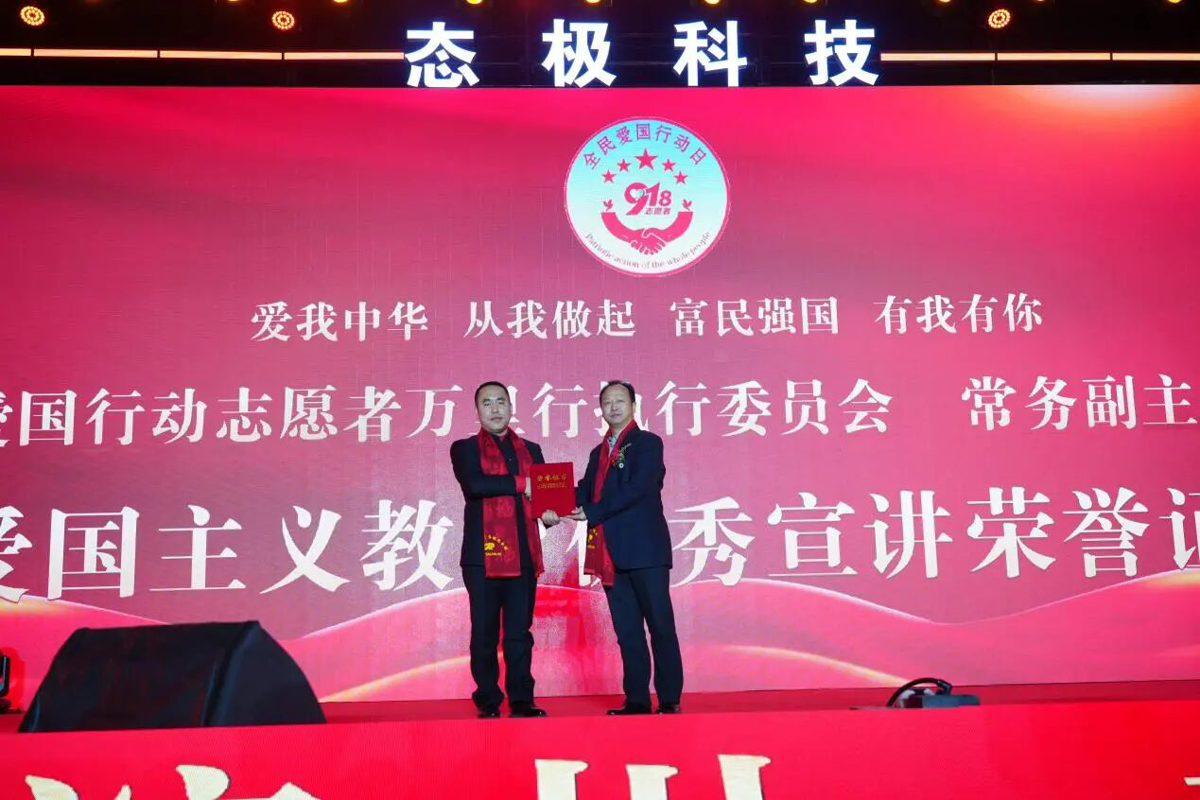 盛典同样洋溢着浓厚的家国情怀。全民爱国行动志愿者万里行执委会副主席巴特尔先生在现场进行了感人至深的爱国主义教育宣讲。随后,执委会常务副主席李辉先生代表组委会,先后为态极科技颁发了“爱国品牌”荣誉称号,为巴特尔副主席颁发了“爱国主义优秀演讲”荣誉称号。这份荣誉是对态极科技将企业发展与社会责任相结合的崇高认可。