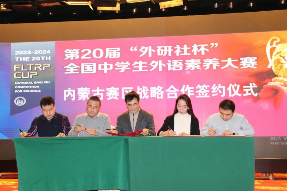 “外研社杯”内蒙古赛区组委会与内蒙古融媒网、恩格贝研学营地、呼和浩特市新城区阳光学校、广华传媒共同签署战略合作协议