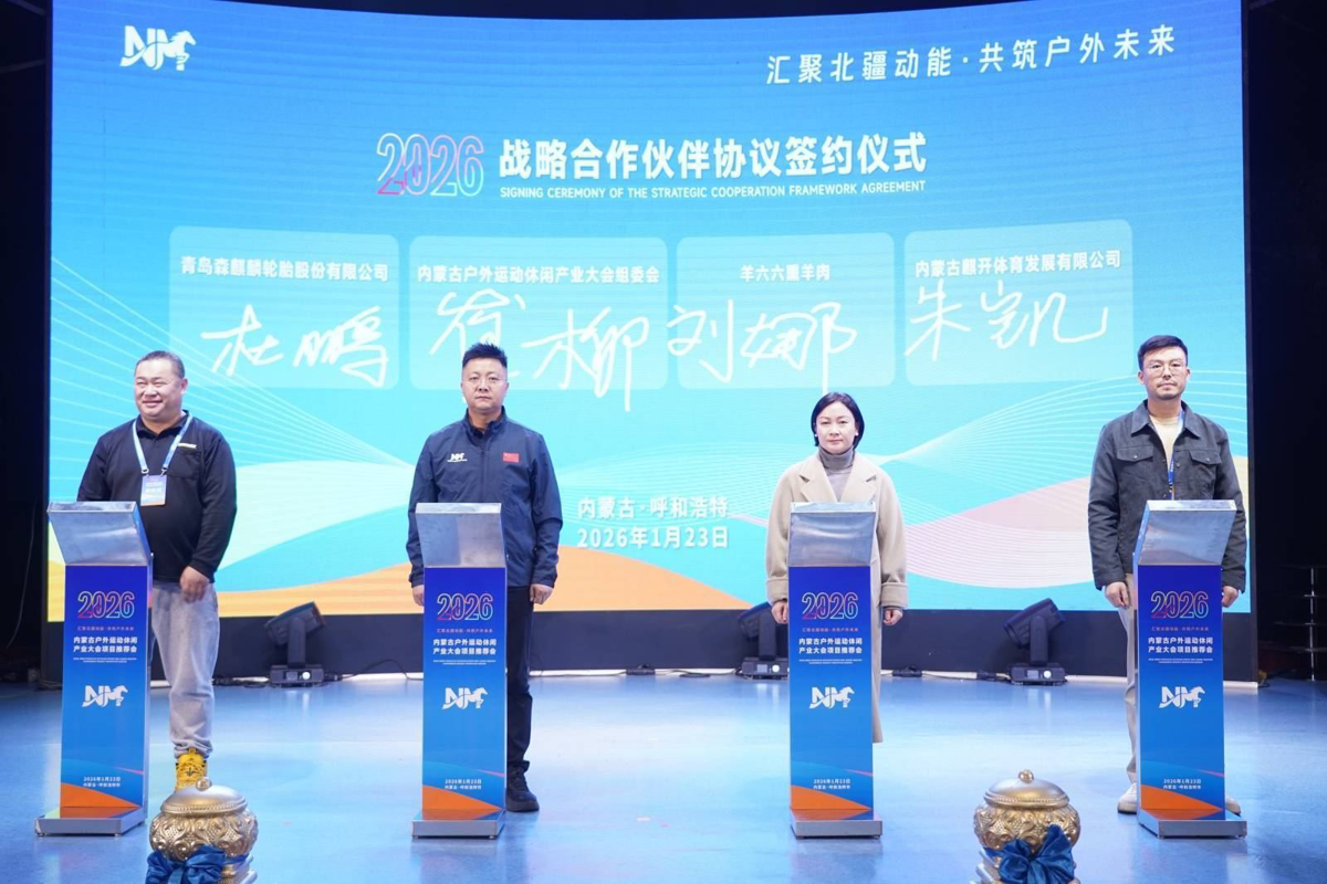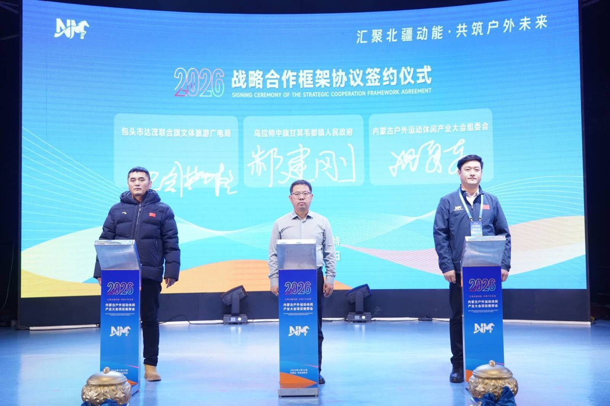 活动现场,包头市达茂旗及巴彦淖尔市乌拉特中旗代表与大会组委会签订战略合作协议,双方将在2026年共同推进户外运动产业各项活动,助力自治区体育产业高质量发展。